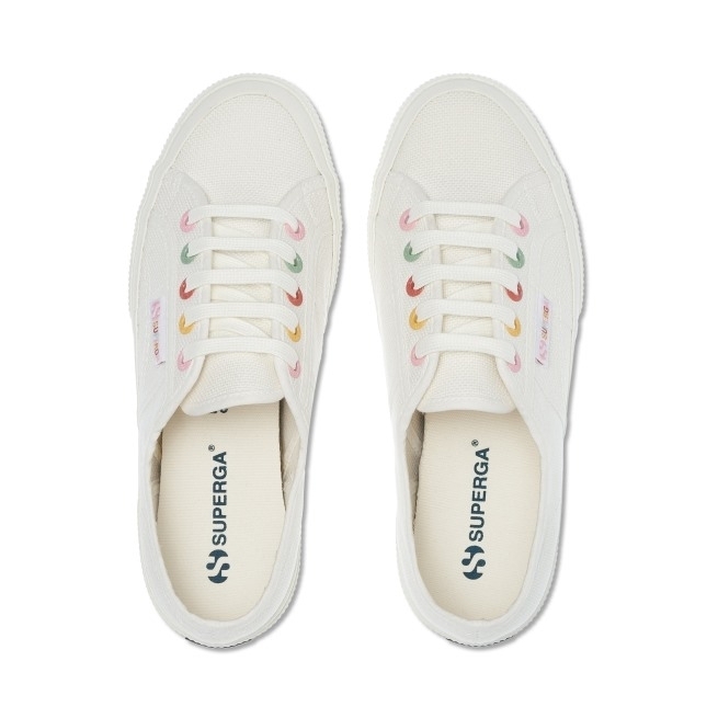 classic Superga 2750: Calçado Desportivo Em Lona Para Senhora Com Parte Superior Sem Forro Em Puro Algodão Extraforte E Totalmente Respirável. Sola Em Borracha Natural Vulcanizada. Ilhós E Etiqueta Nas Cores Do Arco-íris.